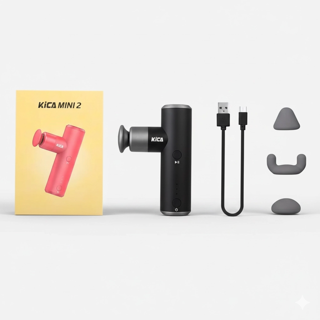 KiCA Mini 2 הוא אחד מאקדחי העיסוי הקומפקטיים החזקים ביותר בשוק, ומשלב עיצוב אלגנטי מאלומיניום עם ביצועים מרשימים. הוא שוקל רק 195 גרם, אבל מספק מהירות של עד 3000RPM, וסוללה חזקה שמספיקה לשעות של שימוש.